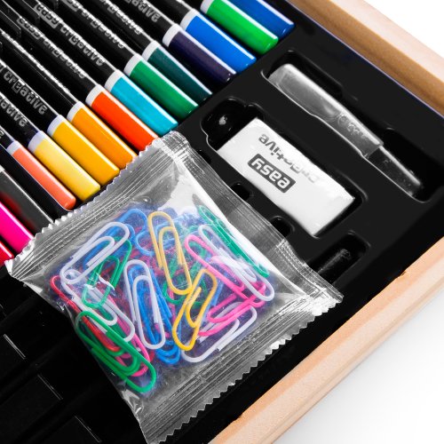 - Praktické doplnky: Fľaštička na vodu, paleta na miešanie farieb a dokonca 30 kancelárskych sponiek na udržanie poriadku vo vašich výtvoroch.