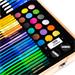 - Vodové farby a ďalšie: 18 vodových farieb pre akvarelové maľby, 3 ceruzky na skicovanie, 3 štetce rôznych veľkostí, 2 gumy a 2 strúhadlá.