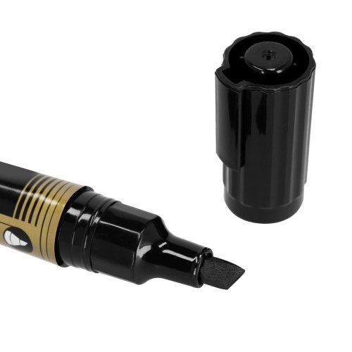 Náplň je uzavretá v elegantnom čierno-zlatom okrúhlom tele. Jeho hrúbka umožňuje pohodlné uchopenie popisovača a jeho ľahké uchovávanie.