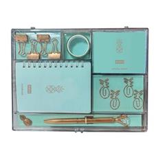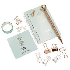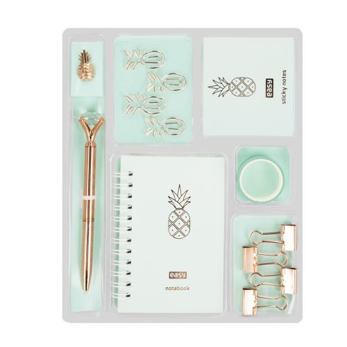 Táto elegantná sada v sebe spája funkčnosť, štýl a štipku tropickej atmosféry. Obsahuje všetko, čo potrebujete na každodenné písanie, plánovanie a organizáciu, a navyše s roztomilými detailmi ananásu, ktoré vám vykúzlia úsmev na tvári.