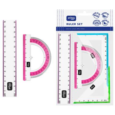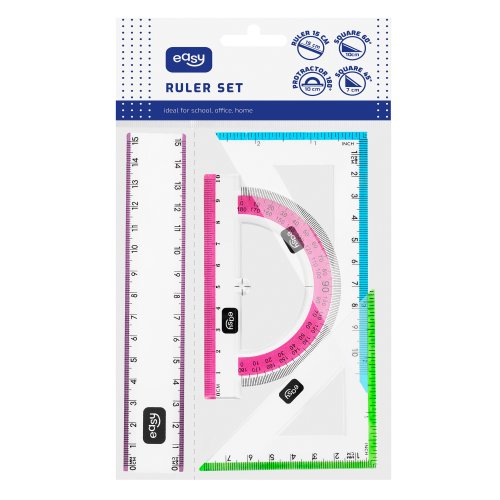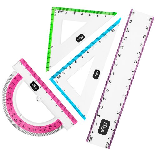 Hľadáte praktickú a štýlovú sadu pravítok pre geometriu? Súprava EASY 4 v 1 obsahuje všetko, čo váš školák potrebuje na rysovanie a meranie: pravítko (15 cm), uhlomer (180°) a dva trojuholníky (45° a 60°).
