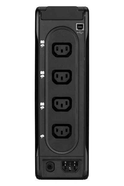 Zdroj je vybavený 3 zásuvkami s ochranou proti prepätiu a záložným napájaním a 1 zásuvkou iba s ochranou proti prepätiu podľa medzinárodných noriem IEC. Vďaka elegantnému a kompaktnému dizajnu sa zdroj hodí do akéhokoľvek prostredia - môžete ho umiestniť horizontálne, vertikálne alebo s voliteľným príslušenstvom aj na stenu či do racku.