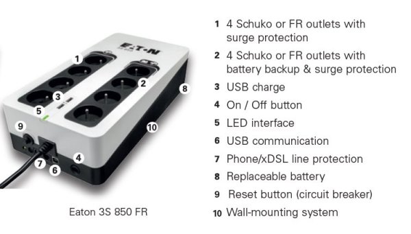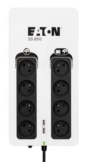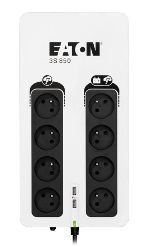 UPS Eaton 3S pomáha chrániť vašu výpočtovú techniku v prípade výskytu nežiaducich javov a udalostí, ako sú atmosférické výboje, búrky, preťaženie rozvodnej siete, poruchy a živelné udalosti, spôsobujúce bez predchádzajúceho varovania výpadky napájania z elektrorozvodnej siete. Pri úplnom výpadku poskytuje UPS záložné napájanie z batérie až štyrom z ôsmich pripojiteľných zariadení. Tento záložný zdroj tiež chráni telefónne, širokopásmové a Ethernetové pripojenie proti prepätiu. Softvér na odstavenie umožňuje automatické uloženie rozpracovaných úloh a ukončenie vašich aplikácií bez straty dát vďaka prepojeniu USB portom . Po obnovení napájania budete môcť pokračovať presne z bodu, v ktorom ste aplikáciu ukončili. Vďaka atraktívnemu dizajnu a páčivej povrchovej úprave UPS 3S dokonale zapadne do moderného kancelárskeho prostredia .