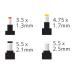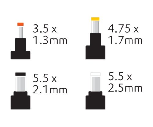 Výstupné zásuvky/konektory: 5,5 × 2,5 mm; 5,5 × 2,1 mm; 4,75 × 1,7 mm; 3,5 × 1,35 mm