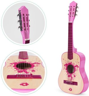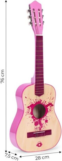 Nauč sa hrať na gitaru! Detská gitara pre dievčatá bola navrhnutá tak, aby mala všetky vlastnosti profesionálneho nástroja. Má kobylku a hmatník so šiestimi strunami (3 kovové, 3 nylonové). Krk má 18 pražcov a je zakončený hlavou s ladiacou mechanikou. Dĺžka gitary: 76 cm Poznámka: Gitara je dodávaná v nenaladenom stave s povolenými strunami.