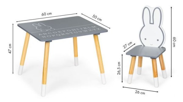 Rozmery stolíka: 60 x 50 x 47 cm. Rozmery stoličky: 60 x 26 x 27 cm. Vyrobený z lakovanej MDF dosky a borovicového dreva. Nábytok je odolný proti poškriabaniu. Všetky hrany sú pre deti úplne bezpečné.
