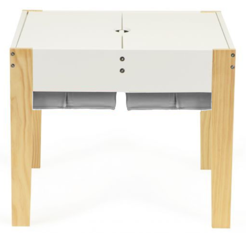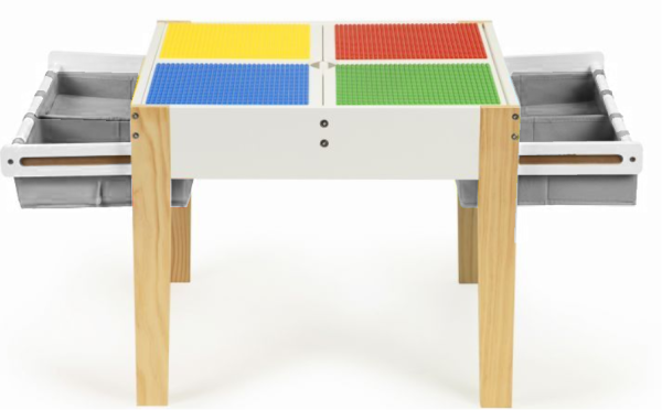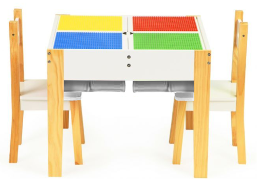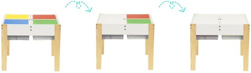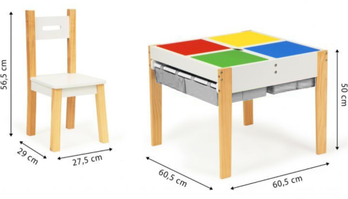 masívne borové nohy dvojdielna odnímateľná doska stola s doskami pre umiestnenie lega 4 výsuvné priehradky v strede stola ideálna pre detskú izbu alebo herňu jednoduchý dizajn v škandinávskom štýle rozmery herného stola: 60,5 x 60,5 x 50 cm rozmery stoličky: 56,5 x 29 x 27,5 cm