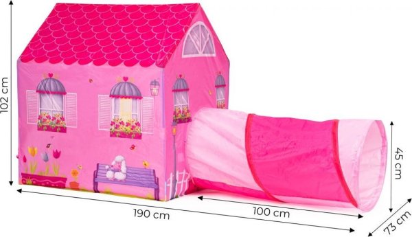 zaujme svojou veselou farebnosťou na prvý pohľad a zaistí zábavu na dlhú dobu poslúži na hranie, ako originálny skrýšu alebo osobný kútik, kde môžu deti odpočívať vyrobený zo 100% polyetera (PES) a obsahuje plastové skladacie tyče a spojnice vstupné dvere možno prichytiť k bokom stanu jednoduchý na postavenie aj zloženie rozmery stanu s tunelom: 190 x 73 x 102 cm