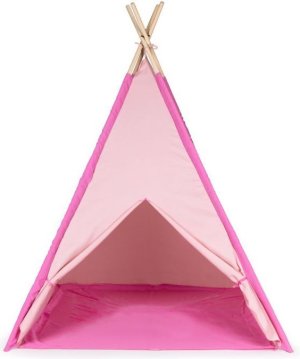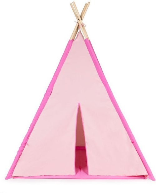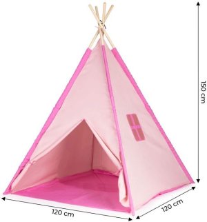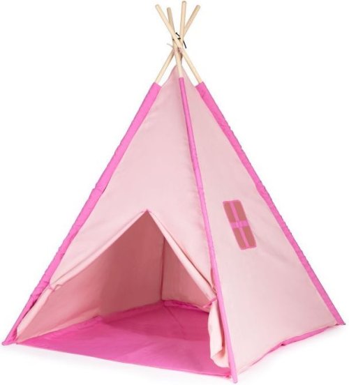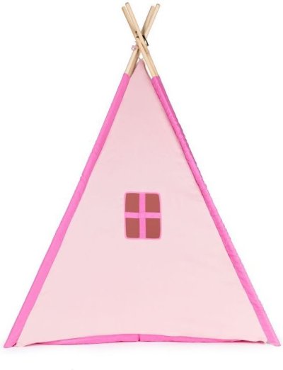 Detský stan s kvalitnou drevenou konštrukciou a okienkom v ružovej farbe.
