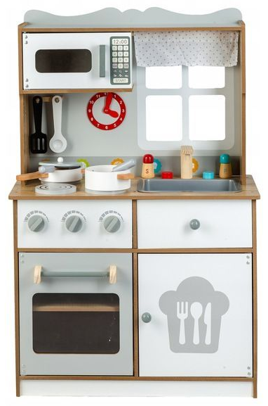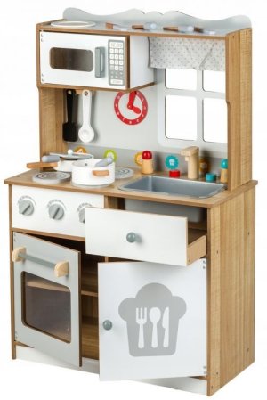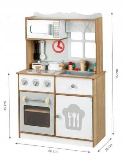Detská útulná kuchynka od značky ECOTOYS je vhodná pre každého malého kuchára alebo kuchárku! Kuchynka je vyrobená z kvalitného dreva. Súčasťou kuchynky je sporák so 4 platničkami, rúra, mikrovlnná rúra, drez s kohútikmi odlišné podľa farby, úložný a odkladací priestor. Deti sa môžu pri varení pozerať z okna so záclonkou, ktoré je súčasťou kuchynky. Na stene kuchynky visí hodiny. Obsahuje doplnky ako je hrniec, panvica s pokrievkou, príbory, 2 taniere, naberačka, obracačka, dózičky na korenie a soľ. Rozmery kuchynky: 60 x 30 x 93,5 cm. Upozornenie: Výrobok je dodávaný v demontovanom stave. Pri zostavovaní postupujte podľa priloženého obrázkového návodu. Montáž smie vykonávať iba dospelá osoba. Na montáž je potrebný skrutkovač (nie je súčasťou balenia).