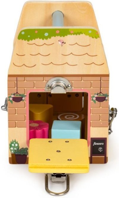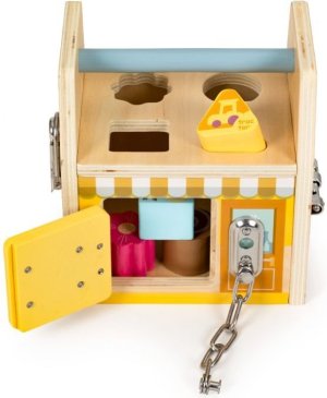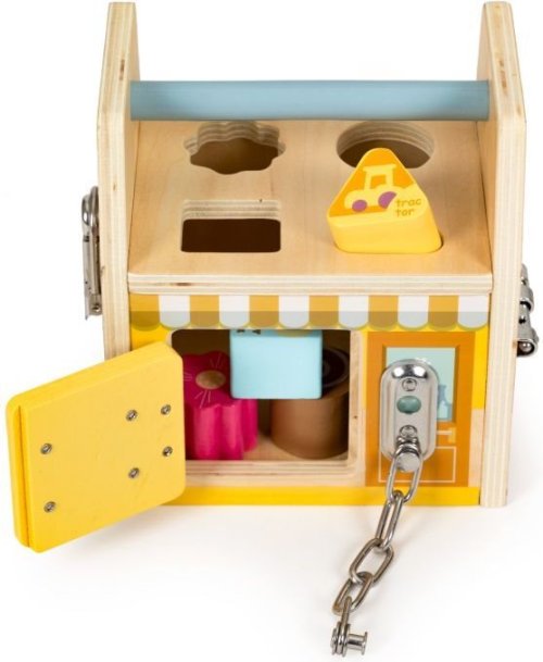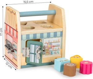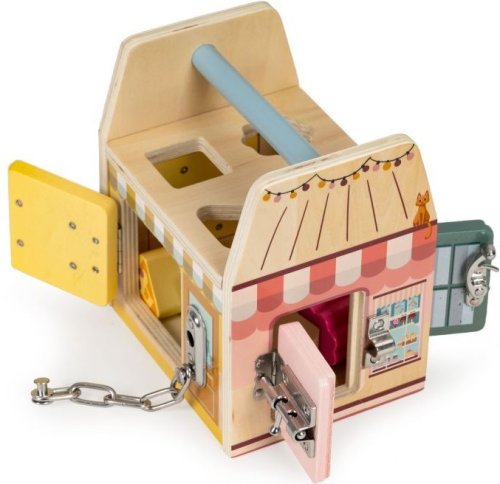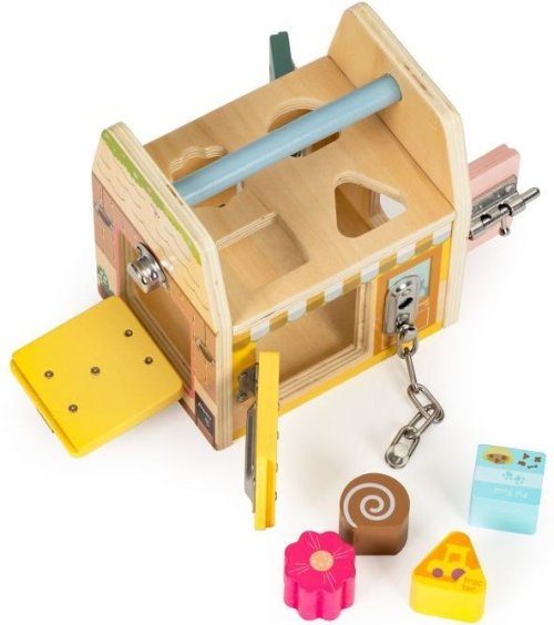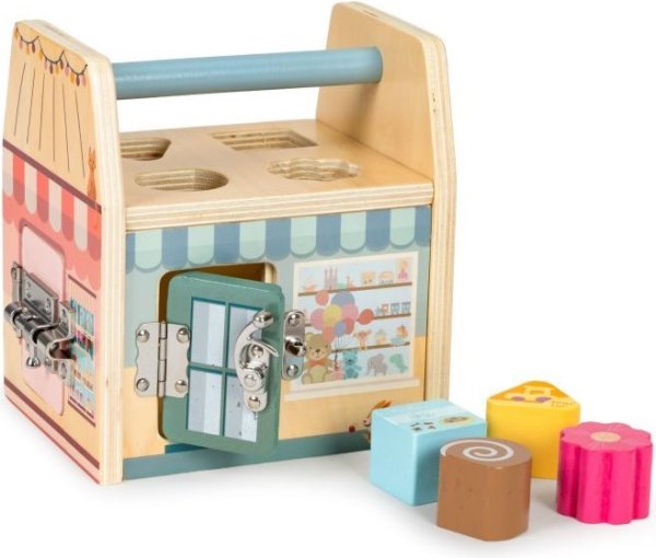 pevná a bezpečná drevená konštrukcia steny kocky sú vybavené rôznymi zámkami, vďaka ktorým môžu deti rozvíjať svoje poznávacie a motorické zručnosti v hornej časti kocky sa nachádza triedička kociek, ktorá dieťa naučí rozpoznávať farby a tvary rukoväť umožňuje ľahké prenášanie rozmery: 15,5 x 17 cm