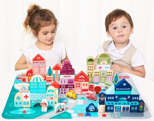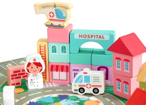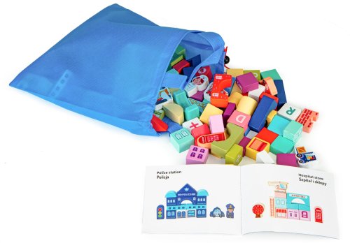 Drevené kocky sú ideálne pre deti, dokonca aj tie veľmi malé – vďaka svojmu tvaru a veľkosti neohrozujú ich zdravie a zároveň umožňujú rozvoj manuálnych zručností, priestorovej predstavivosti a schopnosti vytvárať prvé štruktúry. Všetky prvky sú natreté pre deti bezpečnými a ekologickými farbami, takže sa nemusíte báť o zdravie svojho dieťaťa. Sada drevených blokov vám umožní postaviť veľké mesto, ktoré zahŕňa budovy ako: hotel, nemocnice, obchod, policajnú stanicu, školu a dokonca aj hasičskú stanicu. Budovy majú navyše svoje vlastné autá, ktoré sa ideálne hodia k úlohe, ktorú plnia. Celé to završuje podložka s ulicami, na ktorých môžeme stavať naše mesto. Brožúra obsiahnutá v sade pomôže pri budovaní a rozpoznávaní každej budovy. Súprava obsahuje priestrannú tašku, vďaka ktorej si vaše dieťa môže vziať kocky na rodinný výlet alebo stretnutie s priateľmi.