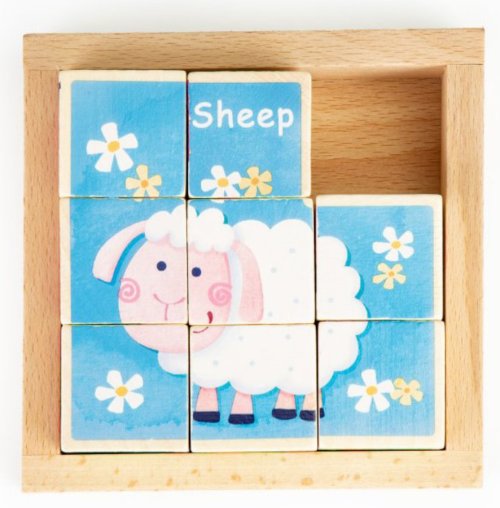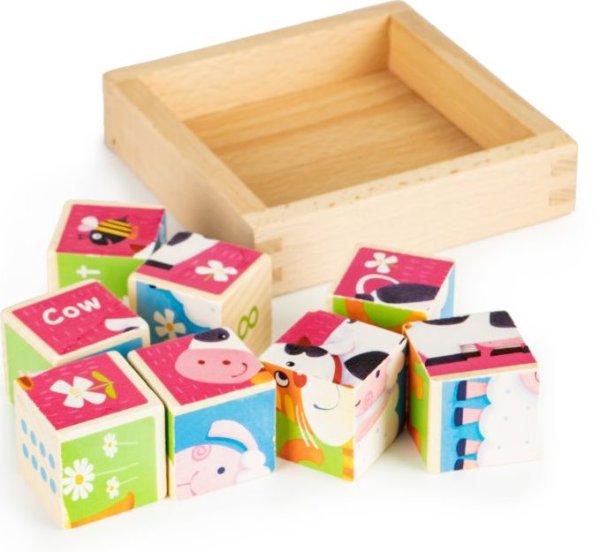 Drevené kocky pre najmenších s motívom 3 rôznych obrázkov zvieratiek a tri odlišné vyobrazenia číslic. Deti si môžu poskladať ovečku, kravu alebo mačku. Súčasťou každého obrázku zvieratka je aj jeho názov v anglickom jazyku. Strany kociek s číslicami majú podobu klasických čísel, rímskych číslic a bodiek ako na hracej kocke. Obrázkové kocky podporujú u najmenších detí koordináciu a motoriku. U starších detí pri skladaní obrázkov rozvíja fantáziu a logické myslenie a motivujú k rozprávaniu príbehov. Vhodné pre deti od 3 rokov.