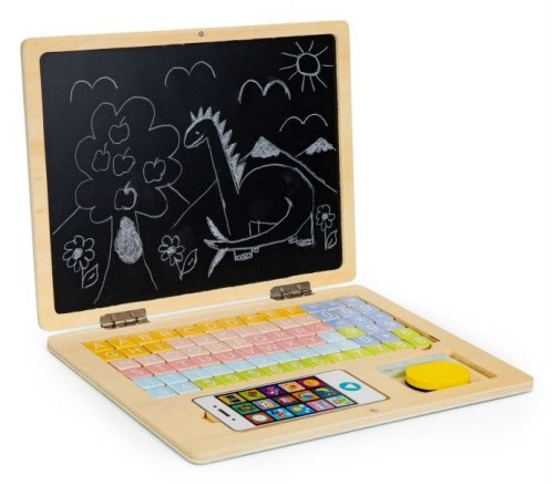 Drevená hračka, ktorá sa bude páčiť a zároveň bude priaznivo pôsobiť na rozvoj dieťaťa. Laptop má namiesto monitora magnetickú tabuľu, na ktorú môžu deti písať a kresliť kriedou. Klávesnicu tvoria magnetické písmenká, číslice a znaky s ktorými idú skladať slová a početné príklady nielen na monitor notebooku. Hračka zoznamuje deti zábavnou formou s písmenami a číslicami. Balenie obsahuje: notebook, 78 magnetických dielikov, 2ks bielej kriedy, hubku a maketu smartfónu Rozmery notebooku: 30 x 22 x 22 cm Rozmer magnetickej tabuľky: 30 x 22 cm Vhodné pre deti od 3 rokov.