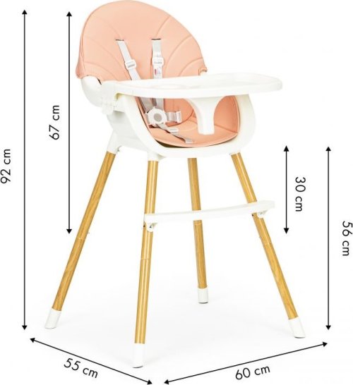 Moderná jedálenská stolička 2v1 je vyrobená z kvalitného materiálu. Stolička je vhodná pre deti od 6 do 36 mesiacov. Môže byť zostavená v dvoch výškach. Výhody stoličky: