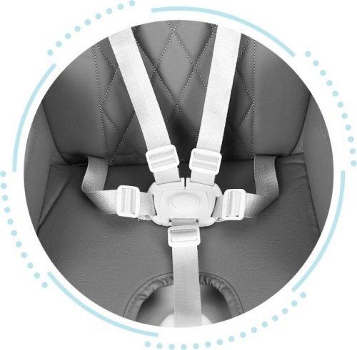 stabilná konštrukcia kovové nohy praktická opierka nôh odnímateľný a nastaviteľný plastový pult pohodlné sedadlo so zábranou proti zosunutiu 5-bodové bezpečnostné pásy odnímateľný poťah z ekokože protišmykové nôžky, ktoré navyše chránia podlahu pred poškriabaním ľahko skladovateľná, možno zložiť do kompaktnej veľkosti stoličku