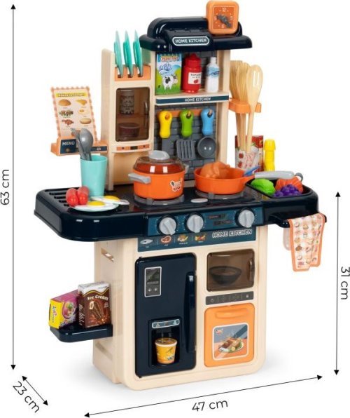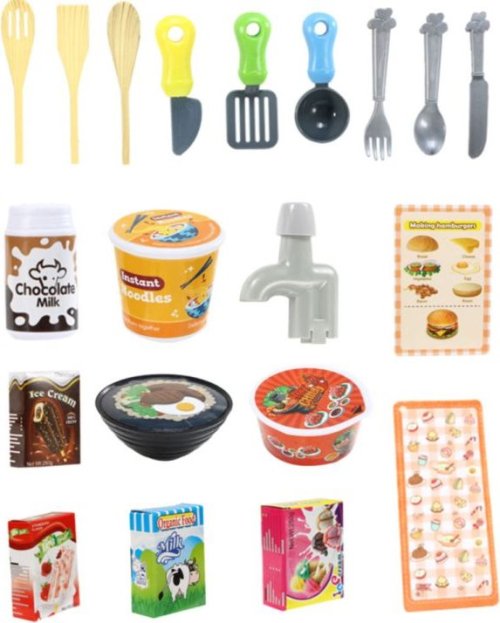 Sada obsahuje: príbory, taniere, pohárik, naberačka, obracačka, varešky, hrniec s pokrievkou, panvica, odmerka, fľaša, mlieko, kečup, polievky, ovocie a zelenina, kura, ryba, krab, kotleta, vajcia, krabica od zmrzliny, u ai. Rozmery zostavenej kuchyne: 63 x 31 x 47 x 23 cm Napájanie: 3 ks batérie typu AA (nie sú súčasťou balenia)