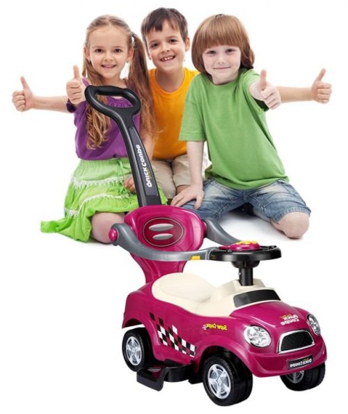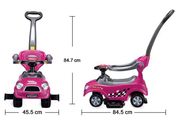 Fialové autíčko s vodiacou tyčou pre deti, ktoré už samostatne sedia. Odrážadlo je vybavené vodiacou tyčou, vďaka ktorej môžu rodičia svoje dieťa viesť. Jednoduché otáčanie je možné aj vďaka funkcii Easy Wheel - predné kolieska sa pohybujú do strán. Tyč je možné nastaviť do dvoch výškových polôh. Po stranách sú odnímateľné zábrany, ktoré usadené dieťa istí a zabraňujú jeho vypadnutiu. Vodiacu tyč aj bezpečnostné zábrany je možné podľa potreby odstrániť. Auto má v spodnej časti po stranách stúpačky pre pohodlné umiestnenie nôh dieťaťa. Pod sedadlom je úložný priestor, do ktorého si dieťa môže uložiť napríklad svoju obľúbenú hračku. Podvozok autíčka bol navrhnutý tak, aby zabraňoval v nechcenom prevrátení vozítka. Autíčko je vybavené multifunkčným volantom. Na volante je päť žltých tlačidiel. Po stlačení tlačidla sa ozve zvukový signál. Volantom je možné otáčať, podľa potreby ho však možno zablokovať. Vozítko s vodiacou tyčou je určené pre deti od 3 do 6 rokov. Rozmery odrážadla: 84 x 45 x 84,5 cm. Výška 84 cm je meraná až po koniec vodiacej tyče. Na prevádzku auta (zvukové efekty) sú potrebné batérie 2 x 1,5V AA batérie. Batérie nie sú súčasťou balenia.