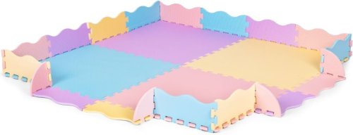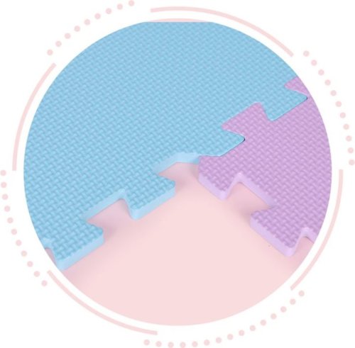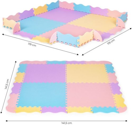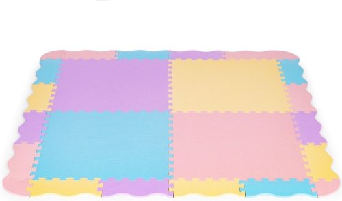Penové puzzle s dielikmi v krásnych pastelových farbách pre deti od 1 roku. Balenie obsahuje 4 štvorcové diely, 16 okrajových dielikov a 4 rohové dieliky. Bezpečná a mäkká podložka je umývateľná, tlmí hluk a izoluje od chladu, je preto ideálna ako hrací koberec nielen do detských izieb. Hrúbka penového puzzle je 1 cm. Veľkosť jedného dielu je 58,5x58,5 cm (merané od zuba po výrez)