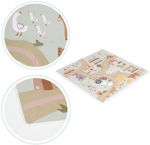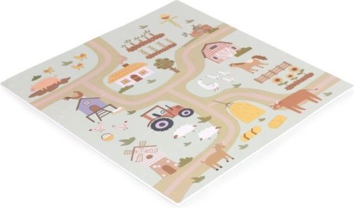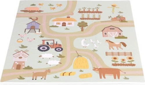 Penové puzzle s potlačou cestičiek, zvierat a statku pre deti od 3 rokov. Balenie obsahuje 9 štvorcových dielov a 12 okrajových dielikov. Bezpečná a mäkká podložka je umývateľná, tlmí hluk a izoluje od chladu, je preto ideálna ako hrací koberec nielen do detských izieb. Puzzle má vrúbkovaný povrch s farebnou potlačou. Hrúbka penového puzzle je 1 cm. Rozmer zloženého puzzle 90,5 x 90,5 cm. Balené v plastovom obale s praktickým uchom na pohodlné prenášanie a zapínaním na zips.