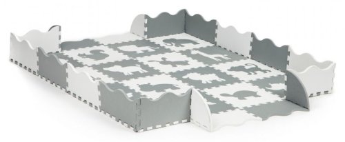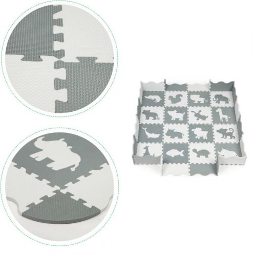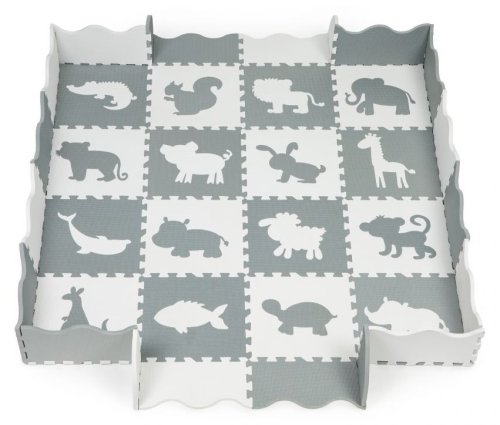 Penové puzzle so svetlo šedými a bielymi dielikmi pre deti od 3 rokov. Koberec má vyberateľné dieliky v tvare rôznych zvieratiek (delfín, ovečka, lev, žirafa, veverička, ...). Balenie obsahuje 16 štvorcových dielikov, 16 okrajových dielikov a 4 rohové dieliky. Bezpečná a mäkká podložka je umývateľná, tlmí hluk a izoluje od chladu, je preto ideálna ako hrací koberec nielen do detských izieb.