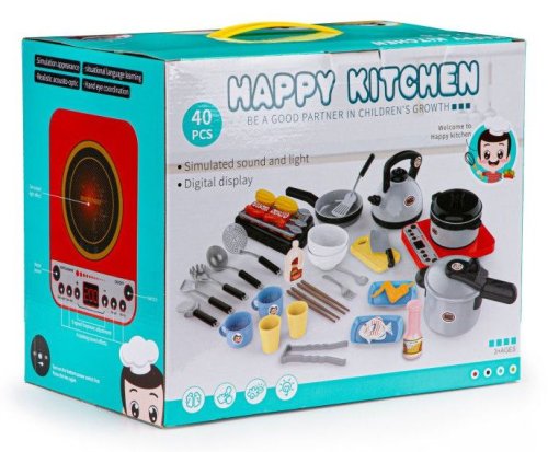 Sada kuchynského príslušenstva je skutočným zážitkom pre všetkých malých kuchárov. Vďaka veľkému množstvu doplnkov bude zábava nekonečná. Formou hry bude dieťa rozvíjať jemnú motoriku, koordináciu a kreativitu. Balenie obsahuje: sporák so zvukovými a svetelnými efektmi, hrniec, kuchynské náčinie, dosku na krájanie, jedálne paličky, misky, tanieriky, hrnčeky a imitácie potravín ako sú kukurice, klobásky, krídelká a ďalšie. Napájanie: 3x AA batérie (nie je súčasťou balenia). Vhodné pre deti od 3 rokov.