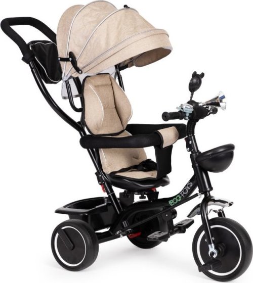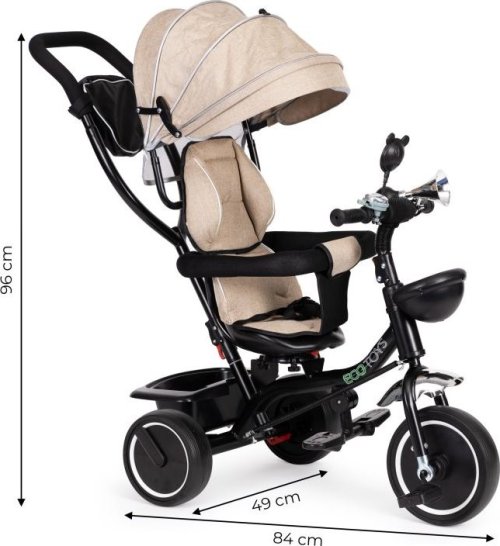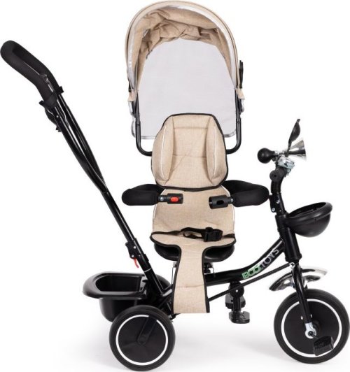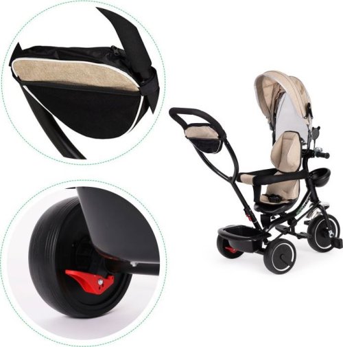 otočné sedadlo o 360 ° uzamknutie riadidiel bezpečnostná brzda sklápacia strieška a stúpadlá na nohy mäkké polstrované sedadlo bezpečnostné pásy košík na riadidlách a na vodiacej tyči masívne, vystužená konštrukcia odolné pneumatiky