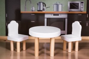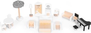 Rozmery domčeka: 78 x 62 x 28 cm Drevená, bezpečná konštrukcia 3 poschodia, 4 rôzne miestnosti v inom štýle a terasa Súčasťou je 15 kusov dreveného nábytku Všetky prvky je možné ľubovoľne odstraňovať a presúvať Rozvíja predstavivosť, kreativitu a manuálne zručnosti
