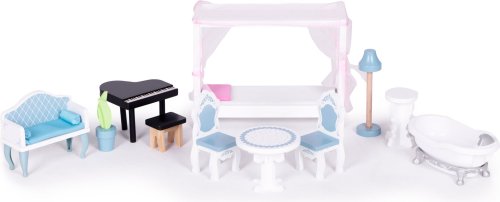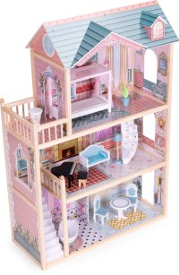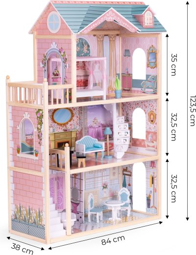 Rozmery domčeka: 123,5 x 38 x 84 cm. Drevená, bezpečná konštrukcia. 3 nezávislé úrovne, 4 rôzne miestnosti v inom štýle. Súčasťou je 11 kusov dreveného nábytku. Všetky prvky je možné ľubovoľne odstraňovať a presúvať bez akýchkoľvek obmedzení. Rozvíja predstavivosť, kreativitu a manuálne zručnosti.