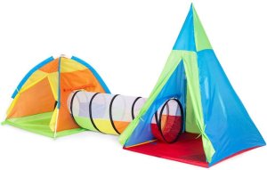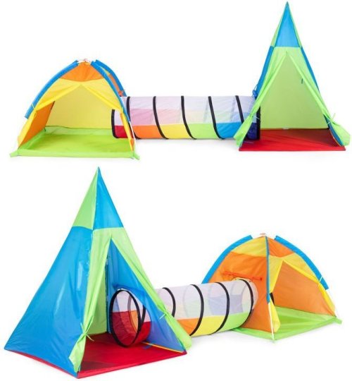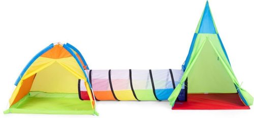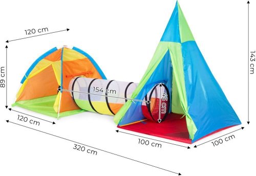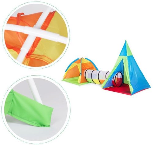 Detský set sa skladá z dvoch stanov (iglov a teepee) a spojovacieho tunela. Farebné stany majú dva vchody - jeden predný a jeden postranný na nasunutie tunela. Všetky časti hernej zostavy sa dajú od seba oddeliť. Stany majú plastový rám a podlahu s vode-odolným efektom, sú tak vhodné nielen do interiéru, ale môžete ho rozložiť aj na záhrade.