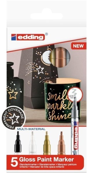 Kaligrafický popisovač EDDING 753 sada 5 ks v metalických farbách je určený pre permanentné ozdobné písanie a zdobenie na hladkých, priehľadných aj tmavých materiáloch, napr. na skle, kove, plaste a kriedovom papieri. Má brilantné vysoko lesklé trblietavé metalické farby. Farebný pigmentový atrament je rýchloschnúci, extrémne odolný voči svetlu a odolný voči rozmazaniu, opotrebovaniu a poveternostným vplyvom. Ventilový systém umožňuje rovnomerný tok atramentu pre dokonalé pokrytie a nepriehľadnosť farby. Je vybavený špeciálnym kaligrafickým hrotom, s ktorým je možné tvoriť od jemných až po široké ťahy, so šírkou stopy v rozsahu od 1 do 2,5 mm. Jednoduché a čisté použitie pre spontánnu kreatívu.