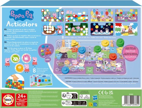 Pomáha učiť sa základné farby a rozpoznávať tvary hravou formou. Podporuje rozvoj jemnej motoriky, vizuálnej diskriminácie a priestorovej orientácie. Hru je možné hrať tromi rôznymi spôsobmi – poskytuje variabilitu a udržuje záujem dieťaťa. Obsah balenia: plastová podložka s madlom, 8 obojstranných predlôh, 44 dielikov v rôznych tvaroch a farbách. Vzdelávacia hra pre deti od 2 do 4 rokov.