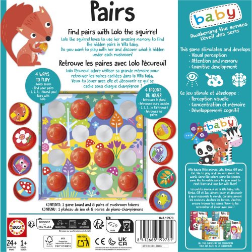 Hra na trénovanie pamäte a experimentovanie. Hľadanie párových obrázkov rôznym spôsobom, spojených aj s dotazovaním dieťaťa. Napríklad všetky hríbiky sú položené na hracej ploche lícom dole. Dieťa si vyberie jeden hríbik, otočí ho, aby zistilo, aký obrázok skrýva, a snaží sa nájsť rovnaký obrázok tým, že si vezme ďalší dielik a vytvorí dvojicu. Rozvíja pozornosť, jemnú motoriku, zvedavosť a predstavivosť. Veľké a silné dieliky pre ľahšie držanie. Učenie formou hry.