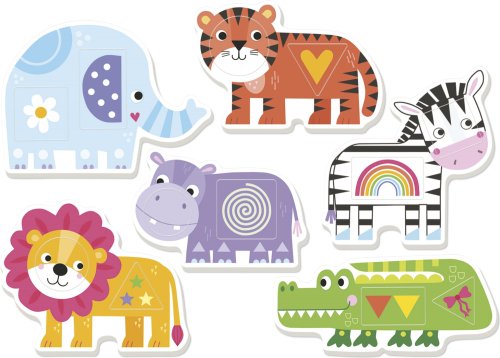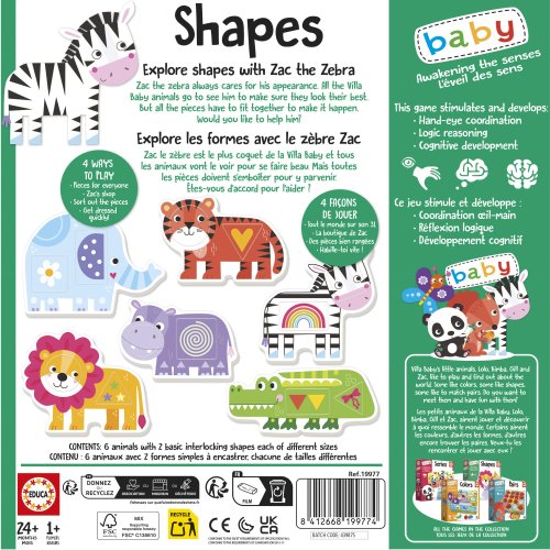 Hra na spoznávanie geometrických tvarov. Porovnávajte tvary, veľkosti a naučte sa rozpoznávať a rozlišovať základné geometrické tvary: štvorec, trojuholník, kruh, obdĺžnik. Rozvíja pozornosť, jemnú motoriku, zvedavosť a predstavivosť. Obsahuje 6 zvieratiek s 2 základnými prepojenými tvarmi. Veľké a silné dieliky pre ľahšie držanie. Učenie formou hry.
