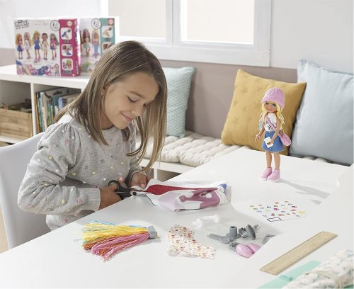 Obsahuje: zostaviteľnú bábiku, látku s predtlačenými strihmi 61x32 cm, módne doplnky, bavlnky na vlasy, dierovač odevov, príslušenstvo, obrázkový návod.