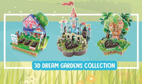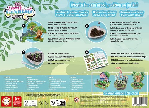 Kreatívna sada EDUCA 3D Dream Gardens na výrobu miniatúrnej záhradky so skutočnými semienkami doplnená kulisami stromového domu. Zložte 3D puzzle, zasaďte semienka a vytvorte si kúzelný svet plný príbehov.