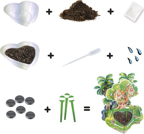Obsah balenia: dieliky na zostavenie dekorácie, kvetináč v tvare srdca, pipeta, balíček zeminy, obálka so semienkami, návod na použitie.