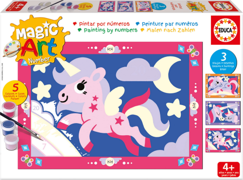 Postupne vyfarbujte jednotlivé časti podľa návodu (každé číslo na plátne zodpovedá jednej konkrétnej farbe). Kreatívna aktivita, ktorá pomáha rozvíjať sústredenie, koordináciu, rozpoznávanie farieb a to všetko zábavnou formou. Balenie obsahuje: 3 obrázky o rozmere 31 x 21,5 cm s očíslovanými časťami, farebnú predlohu, sadu 5 farieb so stojanom, stojanček na postavenie a štetec.