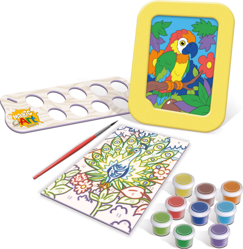 Postupne vyfarbujte jednotlivé časti podľa návodu (každé číslo na plátne zodpovedá jednej konkrétnej farbe). Kreatívna aktivita, ktorá pomáha rozvíjať sústredenie, koordináciu, rozpoznávanie farieb a to všetko zábavnou formou. Balenie obsahuje: 2 obrázky o rozmere 20,5 x 15,5 cm s očíslovanými časťami, farebnú predlohu, sadu 9 farieb so stojanom, plastový rámček na postavenie a štetec.
