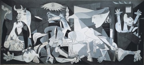 Guernica je obraz Pabla Picassa vysoký 349 cm a široký 777 cm. Picasso ho zhotovil za necelý mesiac. Zákazku mu už skôr zadala španielska republikánska vláda, obraz mal byť súčasťou španielskej expozície na Medzinárodnej výstave moderného umenia a techniky v Paríži v roku 1937. Picasso prácu odkladal, impulzom sa mu nakoniec stalo vybombardovanie mesta Guernica, ktoré sa odohralo 26. apríla 1937. Zobrazuje ženu, býka a kone ako strašných súputníkov vo svete hrôzy, všetko je vyvedené v čiernej a bielej farbe. Obraz si získal celosvetovú známosť. Viac na Wikipédii Rozmer zloženého puzzle cca 144 x 68 cm