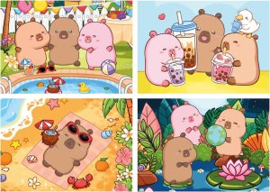 Štyri samostatné puzzle o veľkosti 28 x 20 cm, ale s rôznym počtom dielikov (od 20 do 80), postupne vedú k zdokonaľovaniu dieťaťa pri skladaní a zvyšovaní obtiažnosti.