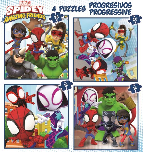Progresívne puzzle s rôznou obtiažnosťou - 4 puzzle s 12 - 25 dielikmi, s vyšším počtom dielikov sa zmenšuje ich veľkosť.