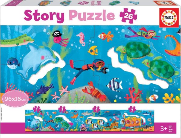 Panoramatické puzzle pre najmenšie deti s príbehom o živote pod morskou hladinou a jeho objavovaním.