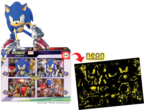 Štyri samostatné puzzle s veľkosťou 34 x 24 cm, ale s rôznym počtom dielikov (od 50 do 150), postupne vedú k zdokonaľovaniu pri skladaní a zvyšovaní obtiažnosti. Progresívne puzzle = s vyšším počtom dielikov sa zmenšuje ich veľkosť. Neónové - fluorescenčné puzzle svietiace v tme zo série NEON FLUORESCENT. Na puzzle nanesená flurescenčná vrstva farby cez deň absorbuje svetlo, čo spôsobí, že v tme časti puzzle svieti. Rozmer zloženého puzzle cca 34 x 24 cm