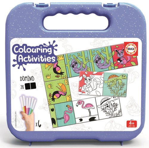 Zábavná hra pre deti Domino s čiernobielymi obrázkami zvieratiek z kolekcie Colouring Activities. Skôr, než začnete hrať Vašu obľúbenú hru - vyfarbite si zvieratká podľa vlastnej fantázie! Domino by nemalo chýbať v žiadnej domácnosti s deťmi. Hranie domina je pre deti zábavné a precvičuje postreh a pamäť. Balenie obsahuje 14 dvojíc obrázkov, 6 fixiek základných farieb. Vhodné pre deti od 4 rokov.