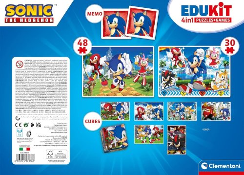 Súbor hier 4v1 Sonic od Clementoni. Obsahuje puzzle 30 a 48 dielikov, 6 platových kociek a pexeso. Puzzle je s rovnakým rozmerom 24 x 17 cm, ale s rôznym počtom dielikov, preto sa s vyšším počtom dielikov zmenšuje ich veľkosť. Balené v kartónovej krabici s plastovým uchom pre ľahké prenášanie. Rozvíja pamäť, logické zručnosti a manuálnu zručnosť. Rozmer balenia: 37x26x4,6 cm. Vek 3+