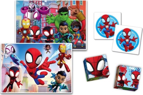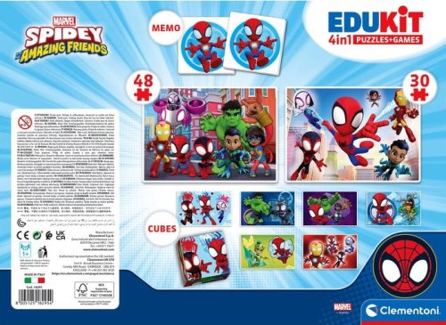 Súbor hier 4v1 Spidey a jeho úžasní priatelia od Clementoni. Obsahuje puzzle 30 a 48 dielikov, 6 platových kociek a pexeso. Puzzle je s rovnakým rozmerom 24 x 17 cm, ale s rôznym počtom dielikov, preto sa s vyšším počtom dielikov zmenšuje ich veľkosť. Balené v kartónovej krabici s plastovým uchom pre ľahké prenášanie. Rozvíja pamäť, logické zručnosti a manuálnu zručnosť. Rozmer balenia: 37x26x4,6 cm. Vek 3+