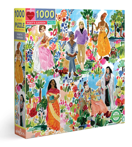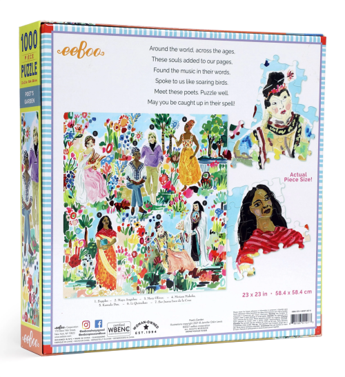 Záhrada básnikov predstavuje sedem milovaných básniek a textárok naprieč stáročiami a kontinentmi. Ich múdrosť a slová naďalej ovplyvňujú dnešný svet. Vo sviežej nebeskej kvetinovej záhrade nájdeme Sapfó, Maya Angela, Mary Oliver, Miriam Makeba, Kamala Dasa, Li Qingzhao a Sor Juana Inés de la Cruz. Vyrobené z 90% recyklovaného šedého kartónu a tlačené atramentmi na rastlinnej báze. Puzzle od amerického výrobcu EEBOO. Rozmer zloženého puzzle cca 58,4 x 58,4 cm