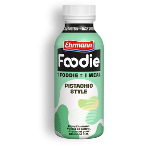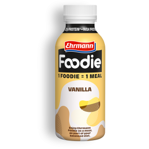 1 Foodie = 1 jedlo. Ehrmann Foodie je lahodné jedlo v podobe nápoja s dôležitými živinami, ktoré vaše telo potrebuje. Fľaša s obsahom 400 ml obsahuje 30 g bielkovín, neobsahuje laktózu, lepok a pridané cukry*.