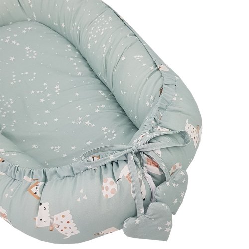 Multifunkčné hniezdo obojstranné pre dieťa s očarujúcim vzhľadom poskytuje bezpečnosť a pohodlie pre spiace deti. Skvelá alternatíva k tradičným perinkám a zavinovačkám. Praktickosť hniezda znamená, že môže byť použitý aj ako podložka na hranie. Hniezdo má vysoké okraje, ktoré uľahčujú položenie dieťaťa na boku, čo je dôležité najmä, keď dieťa má reflux.